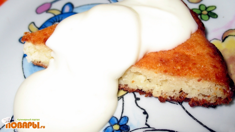 Готовую запеканку остудить, вытянуть из формы, полить сметанным кремом и наслаждаться.