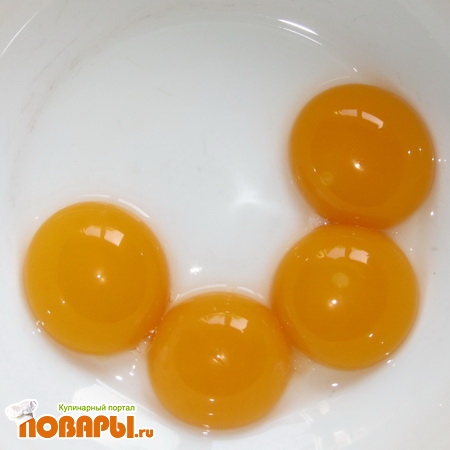 Берем четыре некрупных куриных яйца, от желтков осторожно отделяем белки, которые, для лучшего взбивания, отправляем в холод.
