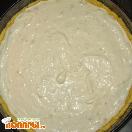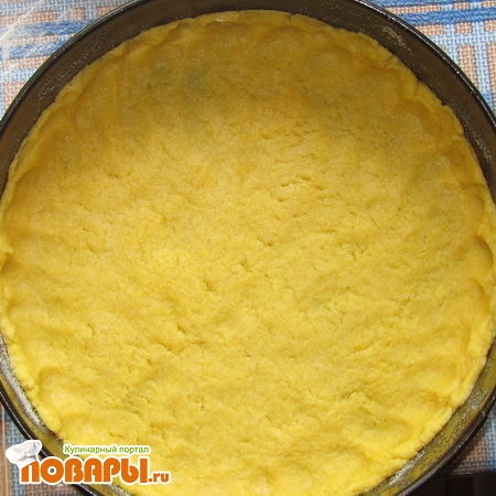 Тесто, распределить рукой по смазанной и посыпанной манкой форме, сделать бортики, выложить сверху начинку и поставить для запекания на 15-20 минут в духовку.