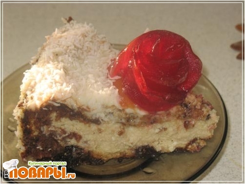 Взбиваем миксером масло с 100 г сахара, пока масса не посветлеет, затем по одному вбиваем 2 яйца, вмешать шоколад. Вмешать муку с разрыхлителем. В конце подмешать 1/2 стакана кокосовую стружку.