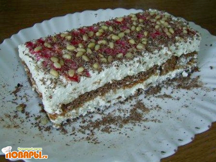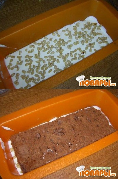 Лучше выстлать форму пищевой пленкой, легче будет доставать. Первую половину творожной смеси выкладываем в форму, посыпаем сверху 1/3 частью орехов, накрываем половинкой песочного коржа. В холодильник на 2-3 часа.