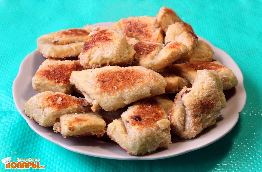 Масло режем на кусочки и даем ему время для размягчения. Добавляем творог и разминаем всю массу до однородности. Затем сыпем сахар, изюм, муку, соду и тщательно вымешиваем. Очень желательно массу поставить в холодильник для охлаждения. Через пару часов тесто раскатываем на доске толщиной 0,5 см.