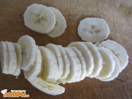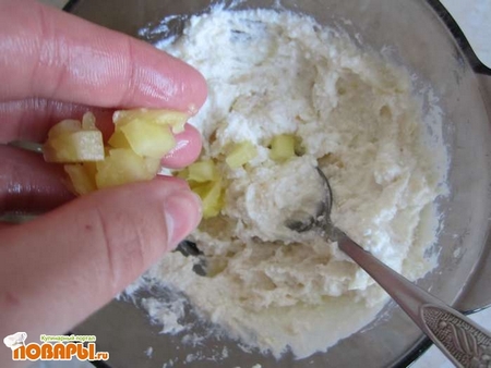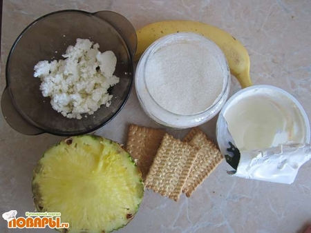 Тщательно разминаем банан, долго и тщательно перемешиваем, взбиваем бананово-творожный крем. Дальше добавляем измельченный ананас.