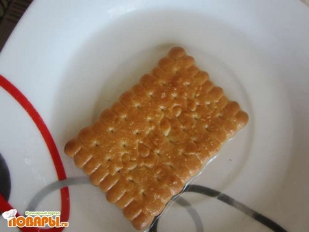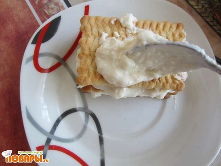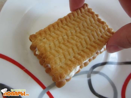 И выкладываем на тарелку. Смазываем печенье кремом и сверху накрываем еще одним размягченным печеньем.