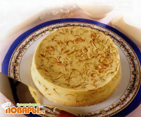 Взбейте миксером творог и йогурт в однородную массу. Добавьте, не переставая взбивать, желток, измельченный на терке имбирь, сок половины лайма, полоски лаймовой кожуры и желатиновую смесь. Взбивайте еще 1 минуту, а затем вылейте смесь в форму поверх коржа. Разровняйте поверхность и поставьте торт в холодильник, как минимум, на 5 часов.