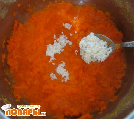 Тыкву необходимо очистить от шкурки и порезать небольшими кусочками. Затем положить в кастрюлю, залить водой и варить на небольшом огне до готовности. Когда тыква сварится и будет мягкой, слить воду и помять ее, чтобы получилась однородная каша без кусочков. Далее ставим тыквенную кашу на маленький огонь и добавляем сахар, ванильный сахар и рис, так, чтобы он оставался на поверхности. Необходимо кастрюлю поставить на маленький огонь и накрыть крышкой. Не забывать периодически помешивать.