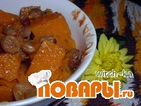Кладем в горшочек тыкву, яблоки, изюм, сахар (если надо), сливочное масло, чуть-чуть воды на донышко. Можно корицы - для любителей.