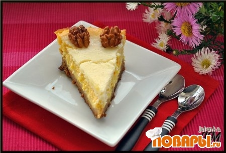 По одному вбить яйца, постоянно при этом работая миксером. Залить смесью основу и выпекать в духовке 1 час при 175 градусах.