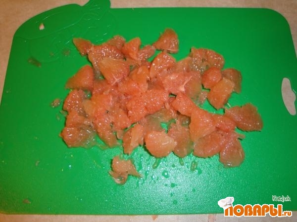 Делим грейпфрут на дольки и очищаем его от белой пленочки.