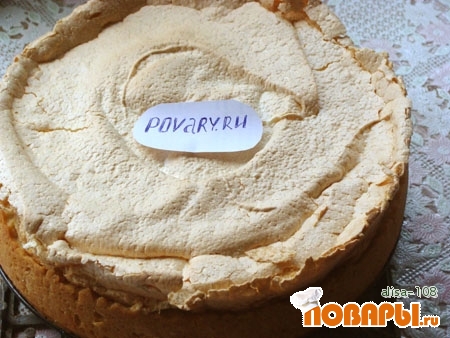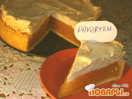 Вынимаем пирог из духовки и выкладываем взбитые белки. Запекаем пирог на верхней полке еще 20-15 мину, пока белки не станут розоватого цвета.