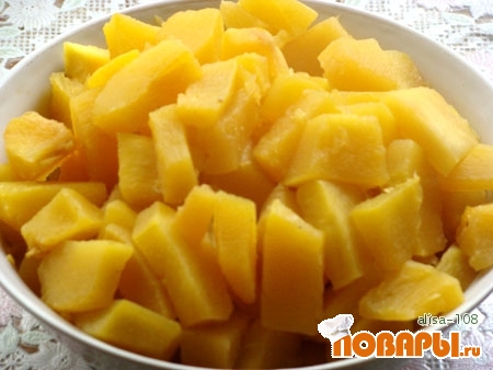 Тыкву очищаем от шкурки. Нарезаем небольшими кусочками и тушим на сковороде примерно 10-15 минут.