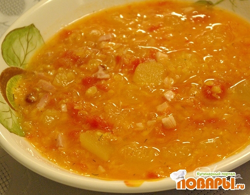 Берем кастрюлю с толстым донышком. Обжариваем кусочки полукопченого бекона с чесноком. Заливаем кипящей водой, добавляем кусочки тыквы, баночку резаных помидоров, красную чечевицу.