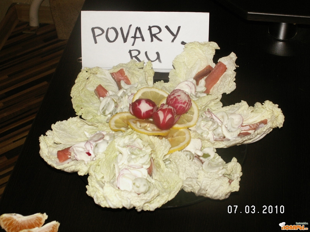 Салат удобен своей порционностью - каждый берет листочек, сворачивает его трубочкой - и откусывает. Для любителей - рекомендуется сбрызнуть лимоном из украшения.