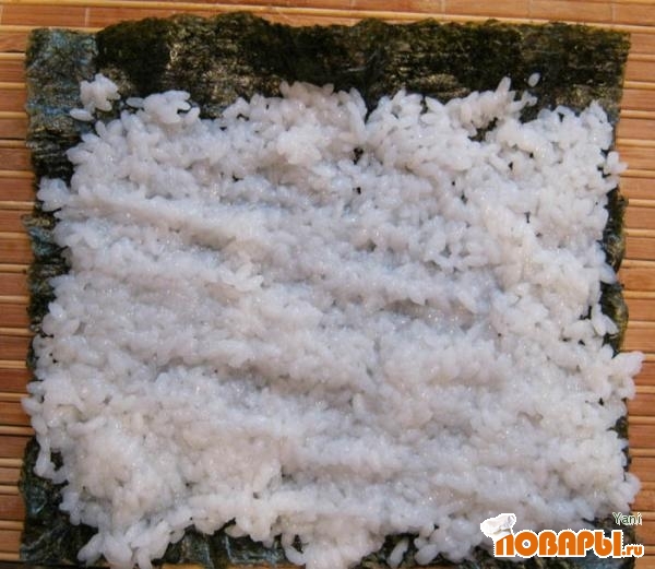 На лист нори, разложенный гладкой стороной вниз на циновке, выкладываем теплый рис ровным тонким слоем.
