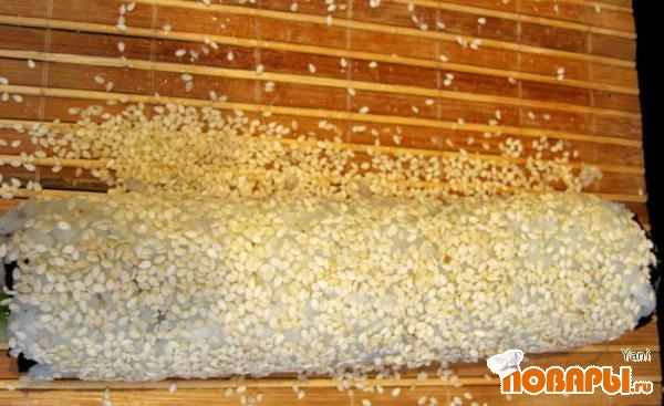 Обсыпаем получившуюся колбаску зернами кунжута (это еще одно отличие от рецепта приготовления самых простых роллов), слегка подсушенными на сковороде.