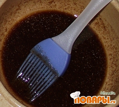 смазываем внутри и снаружи такой смесью: 3 столовые ложки меда с двумя столовыми ложками соевого соуса;