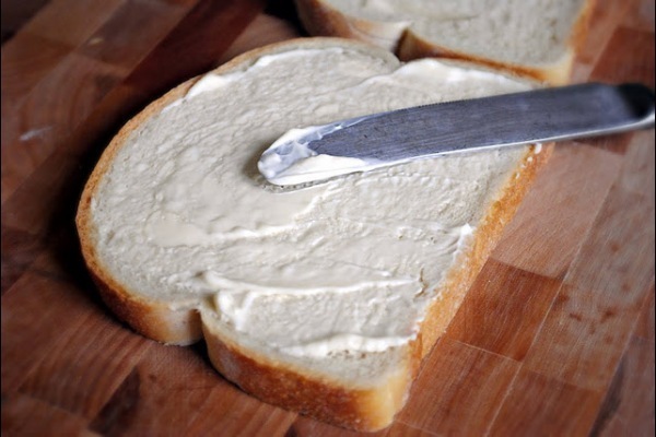 Сначала обжарьте хлеб и бекон. На медленном огне что бы не подгорело. Потом майонезом смазываем хлеб.