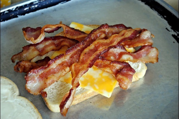 Потом свеху ложим сыр. Хохланд или какой вы предпочитаете. В принципе подойдет любой. На сыр выкладываем бекон. Ты чувствуешь запах?! ДА ДА ЭТО ОН!