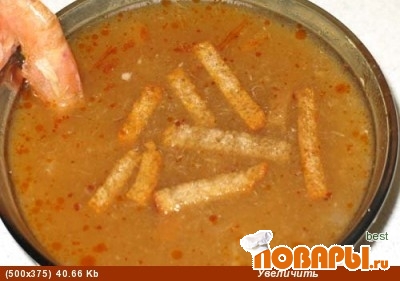 В бульон добавить креветки. Как только вода в кастрюле снова закипит, добавить крупу, овощи и специи, перемешать и варить 3 минуты или до готовности креветок.