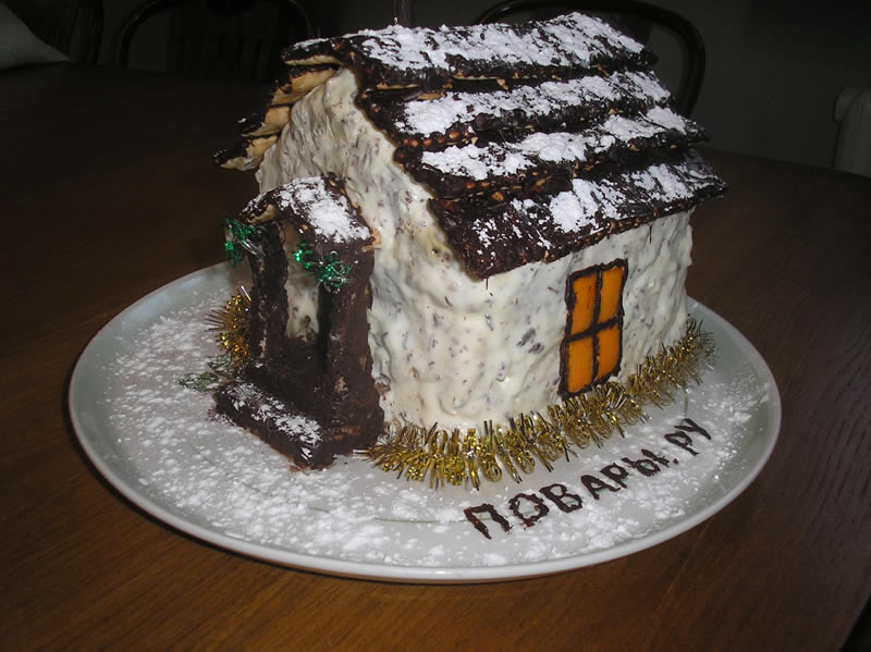 Достаём торт из холодильника. Приделываем к нему с помощью крема или шоколада ступеньки и столбики. Сам домик со всех сторон. в том числе и крышу (кроме крыльца и столбиков) обмазываем штукатуркой. Минут на 10-15 в холодильник.