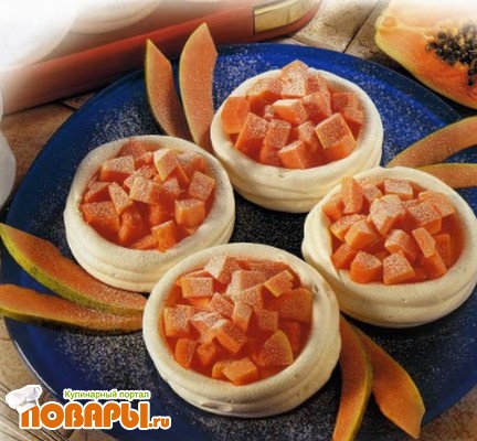 Распределите кусочки фруктов по валованам из безе и сразу же подавайте с охлажденным полусладким шампанским.