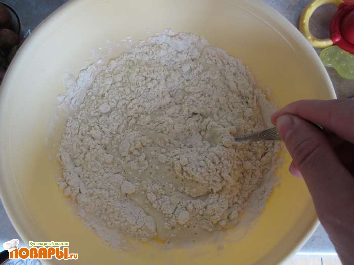 Делаем тесто. Для этого соду и соль добавляем в муку, аккуратно смешиваем в глубокой посуде. В полученную смесь вливаем стакан сыворотки и все тщательно перемешиваем.