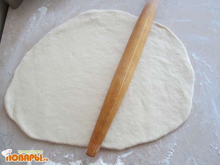 Готовое тесто кладем на час в холодильник.Когда время пройдет, выкладываем его на предварительно посыпанный мукою стол, и раскатываем с помощью качалки . Тесто должно быть толщиной не менее 0,7 см.
