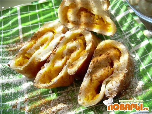 Размешать, чтобы масса была густая, свернуть тесто в трубку, чтобы приняло вид длинного рулета, уложить его на сковороду, намазанную ложкою масла. Класть плотно в кружок, сверху смазать ложкою масла, посыпать ложкою мелкого сахара, поставить в печь, чтобы испеклась.