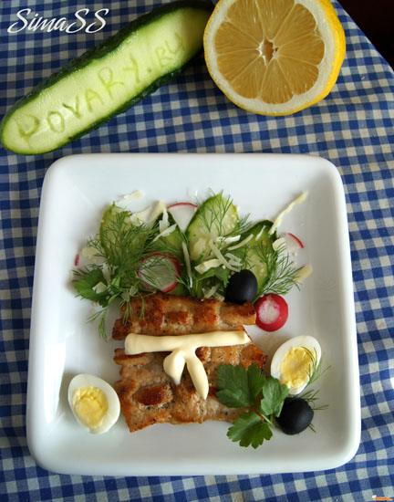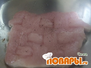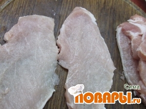 Свинину тонко нарезать, отбивать не стала, т.к. мясо очень нежное. Один кусочек отложить, а другой нарезать полосками шириной 1 см. Сделать небольшие прорези в сплошном кусочке. "Прошить" целый кусок "лентами" из мяса. Обрезать "хвостики".