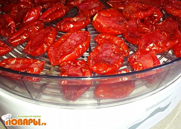 Сушатся такие помидорки порядком двух дней, в сушилке для овощей и фруктов. Так же можно сушить в духовой печи, в течение 10 часов, выложив помидоры на противень, при температуре 80 градусов. Периодически открывая духовку, чтобы испаренная влага уходила.