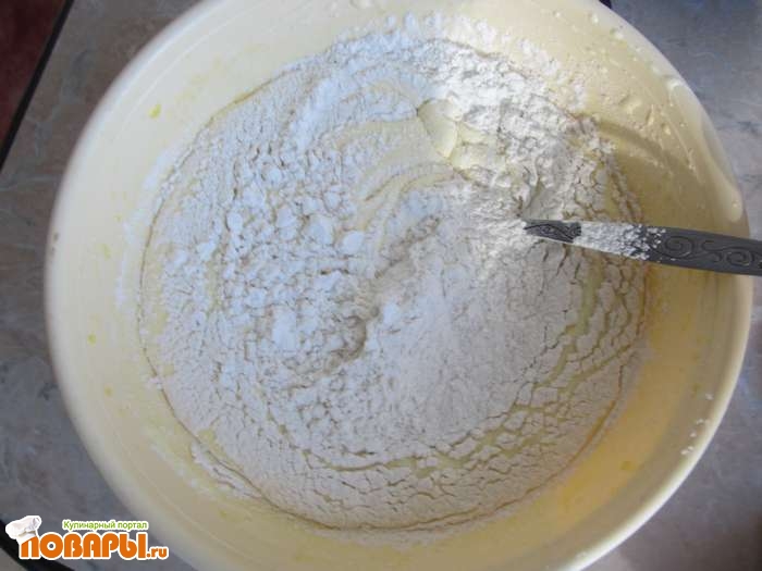 Дальше берем и просеиваем пшеничную муку и постепенно добавляем в полученную смесь, хорошо перемешиваем.