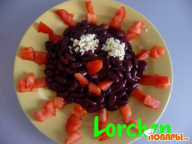 С фасоли сливаем жидкость, промываем холодной водой. Выкладываем в центр тарелки.