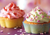 Остудите, украсьте взбитыми сливками (0,5 литра охлажденных жирных сливок взбить с 2 ст. л. сахарной пудры), подкрашенными пищевым красителем. Распределите крем на кексы с помощью кондитерского рожка и посыпьте съедобными украшениями.
