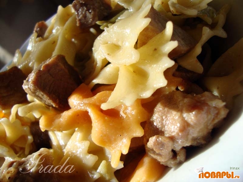 Сварить бантики,добавить их к мясу с одним стаканом отваром,где варились макароны, тушить еще минут 10 на среднем огне( до испарения отвара).