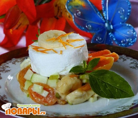 На тарелки выложить с помощью формы салат, сверху положить по шарику ванильного мороженого, посыпать апельсиновой цедрой, украсить ломтиками банана, веточкой мяты.