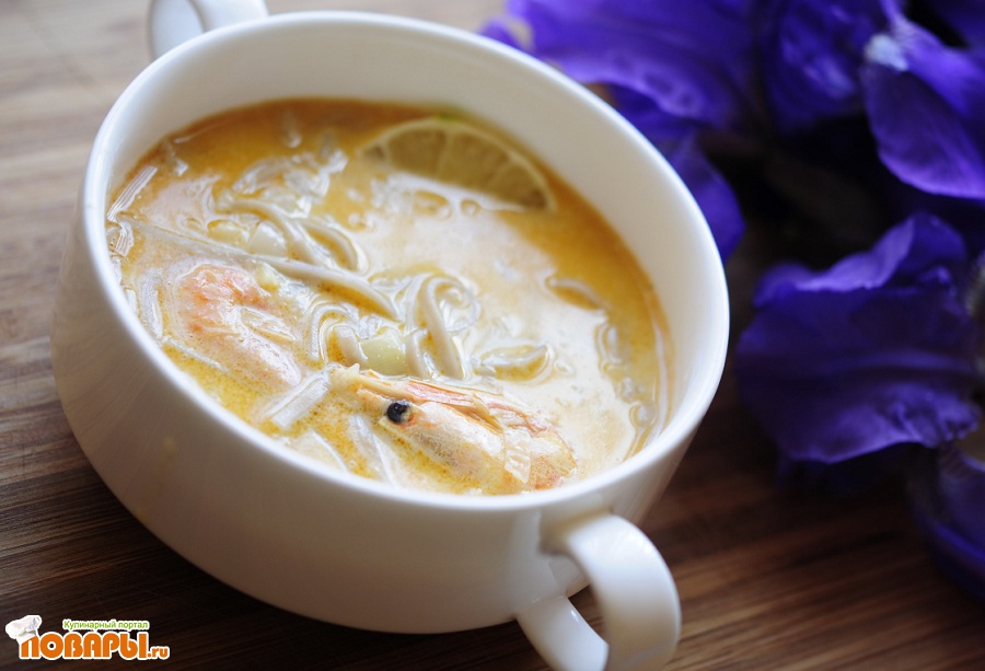Теперь самое время, в масло положить лук (порезанный мелкими кубиками). Жарим до золотой корочки лук, после добавляем Том Ям пасту и заливаем водой, или куриным бульоном, в среднем 3 стакана. Поварить минут 10 . Добавить креветками, поварить еще минут 5, только заранее хорошо промойте их. Самое время посолить.