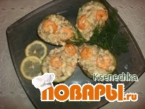 Плоды авокадо разрезаем вдоль, вынимаем косточку и аккуратно достаем мякоть, не повредив кожицу. Мякоть быстро нарезаем кубиками, сбрызгиваем лимонным соком и смешиваем с креветками, грибами, тертым сыром и яйцом, семенами кунжута и 1-2ст.л. майонеза