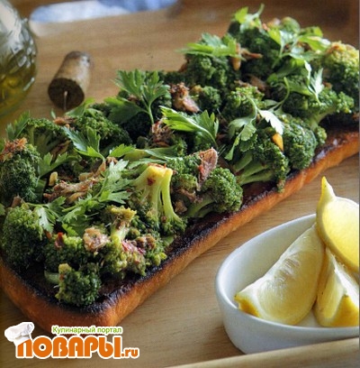 Для того чтобы сделать брускетту, нужно хлеб запечь в духовке или поджарить в тостере, натереть чесноком и сбрызнуть оливковым маслом. На брускетту выложить брокколи в соусе с анчоусами, сверху полить еще немного оливковым маслом. Подавать с четвертинками лимона.