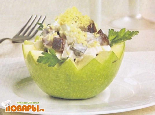 Яблоки разрежьте пополам и, удалив сердцевину и часть мякоти, сбрызните лимонным соком. Филе сельди, яичные белки и мякоть яблок нарежьте кубиками. Заправьте майонезом. Полученной смесью заполните половинки яблок. Посыпьте тертым желтком и оформите зеленью.