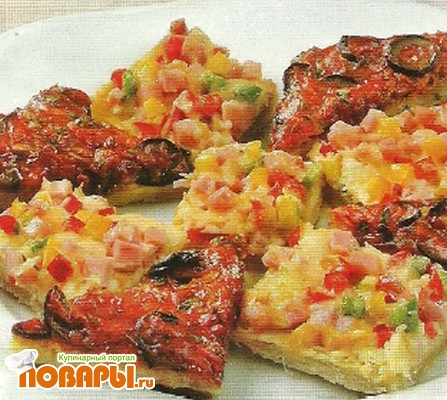 Тесто разделите пополам и раскатайте в пласты толщиной 0,7 см, смажьте растопленным сливочным маслом. Уложите пласты теста на противни, слегка смазанные маслом, сверху разложите на один томатную начинку, на другой - начинку с ветчиной.