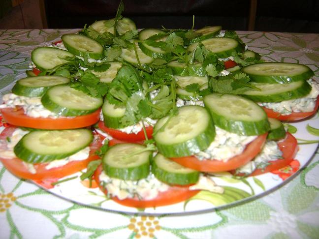 Сыр натереть на терке, смешать с чесноком зеленью и майонезом. Огурцы и помидоры нарезать кружочками. Далее уложить в блюдо кружок помидора, сырную смесь, огурец. Украсить зеленью.