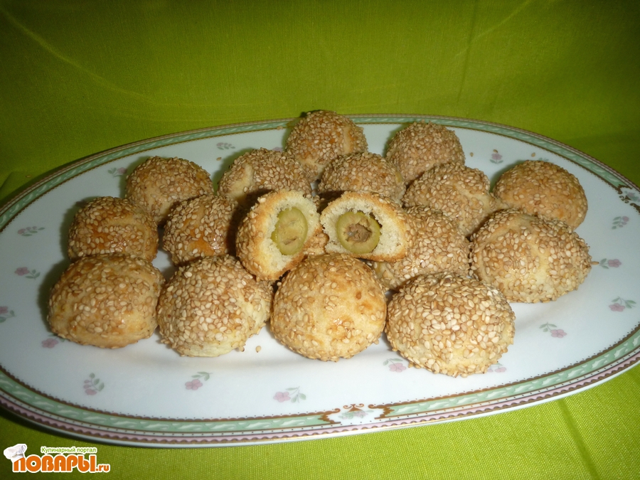 Насыпать в мисочку кунжут. Колбаску теста разрезаем на маленькие кусочки. Каждый кусочек разминаем в лепёшечку и вкладываем внутрь оливку. Защипываем и скатываем шариком.