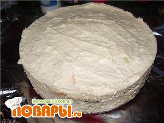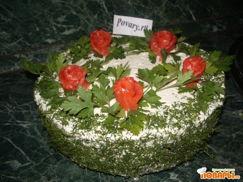 Утром из оставшегося майонеза, творожного сыра , желатина готовим сырный крем по той же технологии что и для прослойки. Снимаем с торта боковинки формы, смазываем бока и верх кремом.. Украшаем рубленной зеленью и розочками их форели. Приятного аппетита!!!