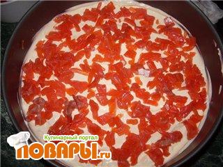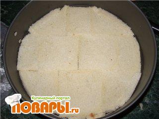 Заливаем 1 пакетик желатина 50 мл хол. воды на 15 минут, потом растапливаем на плите, но не кипятим. Даем желатину чуть остыть, добавляем в майонезно сырную смесь и еще раз взбиваем. С хлеба срезаем корки и выкладываем дно разъемной формы...Мелкие пустоты заполняем обрезками хлеба...