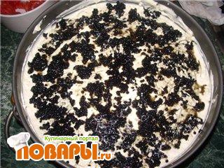 слой черной икры с краб палочками, еще слой хлеба,сверху крем сырный. оставляем на ночь в холодильнике для застывания.