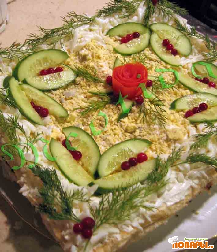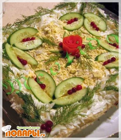 намазываем тортик сверху творожным кремом (у меня - Creme bonjour), серединку заполняем измельченным желтком, по краям - тертые на крупной терке белки, немного огурчиков, клюковки, укропчика и цветочек из помидорчика..
