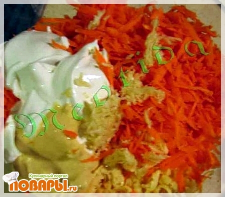 сыр и морковь (оставшиеся 2 штучки) трем на крупной терке, чесночок - на мелкой, добавляем 4 стол.л. сметанки и 4 ч.л. горчицы, все хорошенько перемешиваем