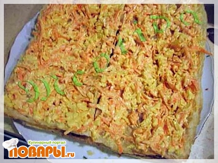кладем следующую пышку и намазываем половиной сырно-морковной массы