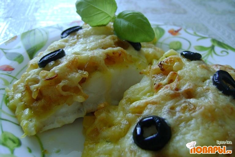 В посуду для запекания выложить рыбу, сверху - лук, сыр, и кружочки маслин.