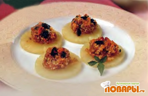 Кружочки ананасов обсушите, уложите на жаропрочное блюдо, выложите на каждый начинку и запекайте при 180 гр. около 15 минут до золотистого цвета.